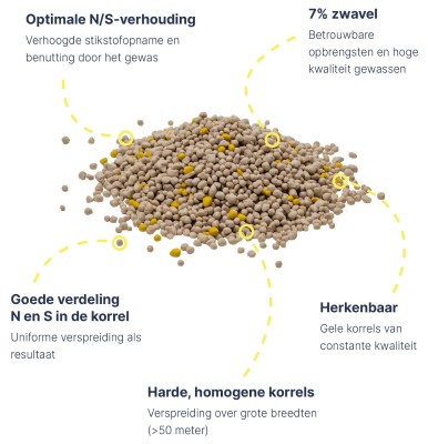De nieuwste toevoeging op gebied van stikstof-zwavel-kunstmest is Dynamon van OCI. Deze meststof heeft een ideale N/S-verhouding van 24% N en 7% S. Uniek is de synergie tussen stikstof en zwavel. Zijn beide elementen in voldoende mate beschikbaar, dan kan een plant N en S effectief en makkelijk opnemen en benutten. Nog belangrijker: om eiwitten te maken, heeft de plant stikstof én zwavel nodig. Als een van de elementen ontbreekt, wordt de synthese aangetast met gevolgen voor opbrengst en kwaliteit.