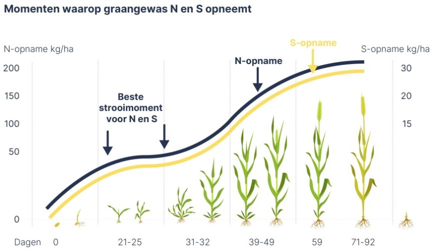 De grootste opname vindt plaats in de periode mei tot en met juni. Na de bloei neemt de plant nog nauwelijks zwavel op. Op dat moment wordt alle in de plant aanwezige zwavel getransporteerd vanuit stengel en bladeren richting de korrel. Daar wordt het opgeslagen als korreleiwit.