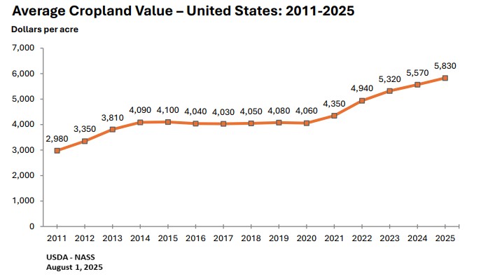 De waarde van landbouwgrond in de VS is in 2025 opnieuw gestegen. Uit een nieuw rapport van het Amerikaanse ministerie van Landbouw (USDA) blijkt dat de gemiddelde prijs voor landbouwgrond met $180 is toegenomen tot een record $4.350 per acre (0,4 hectare). Dit is het vijfde jaar op rij dat de prijzen behoorlijk hard stijgen.