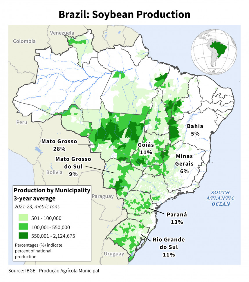 In Brazilië kwam de overheidsinstantie Conab met een nieuwe opbrengstraming. De totale sojaoogst in het land wordt geraamd op 177,6 miljoen ton. Het areaal beteeld met soja stijgt ten opzichte van vorig seizoen met 3,6% naar 49,1 miljoen hectare. Door droogte loopt het zaaien van soja in de provincies Goiás en Minas Gerais achter op andere jaren volgens Conab. Gemiddeld voor het hele land ligt het percentage soja dat reeds gezaaid is rond het meerjarig gemiddelde. De prognose voor de maïsoogst in Brazilië komt uit op 138,8 miljoen ton. Dat is 200.000 ton meer dan in de vorige voorspelling van Conab. De raming voor tarwe is met 7,7 miljoen ton ongewijzigd, maar dit is een klein gewas in Brazilië.