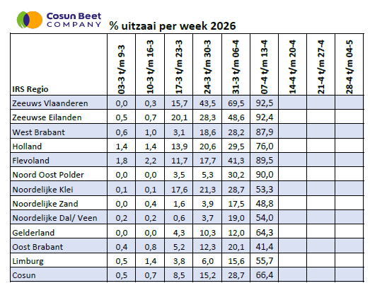 In het noorden en noordoosten was het lange tijd te nat, maar daar is in de afgelopen week ook een flinke hoeveelheid bieten gezaaid. Op zowel klei-, zand- als dalgrond is inmiddels de helft van de bieten gezaaid. Dat geldt ook voor Limburg, waar begin deze week 55,7% van de bietenpercelen is ingezaaid.
