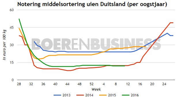 In Duitsland blijft de prijsrange voor gele zaaiuien met een middelsortering, geleverd in Big Bags en afgehaald sorteerbedrijf gevangen tussen 11,00 en 13,00 euro per 100 kg. De laatste voorraadmeting van half februari gaf aan dat er meer uien nog in voorraad liggen. Uit berichten van de afzet van Duitse uien kan worden opgemaakt dat de afzet in eigen land goed loopt, maar dat er in de exportmarkt te weinig afzet is te realiseren. Daardoor ontbreekt het instrument om stemming te maken en de prijzen in beweging te brengen.