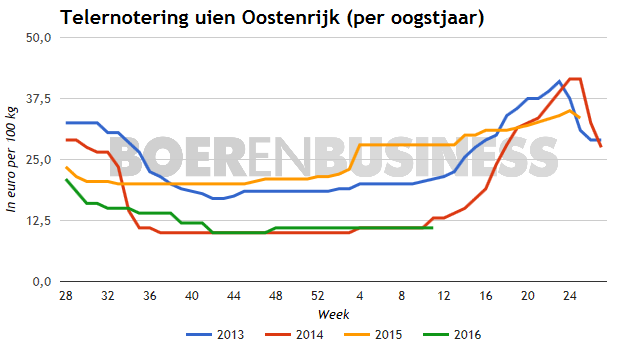 Van een stabiel prijsniveau is ook in Oostenrijk sprake. Daar worden de uien af teler, gesorteerd en los geleverd in kisten verhandeld voor prijzen tussen 9,00 en 13,00 euro per 100 kg. De Oostenrijkse uientelers zorgen voor meer dan voldoende aanbod ten opzichte van de vraag. Ook in Oostenrijk is de afzet van uien in eigen land goed te noemen, maar zou de vraag vanuit het buitenland mogen groeien.