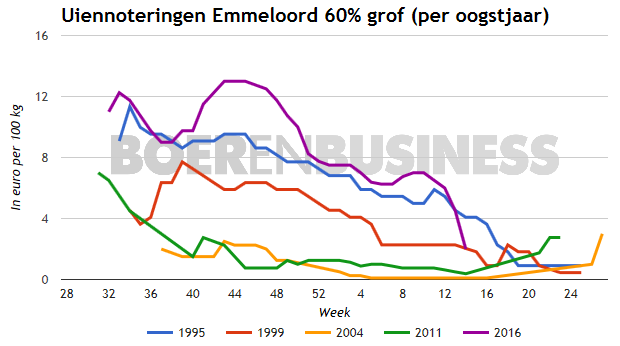 Voor de 30% tot 60% grof sortering gele zaaiuien in Emmeloord kon deze week geen notering worden vastgesteld vanwege te weinig transacties. De notering van de 60% grof sortering daalde met gemiddeld 2,50 euro naar een notering van 1,00 tot 3,00 euro per 100 kg. De stemming is ‘Flauw’.