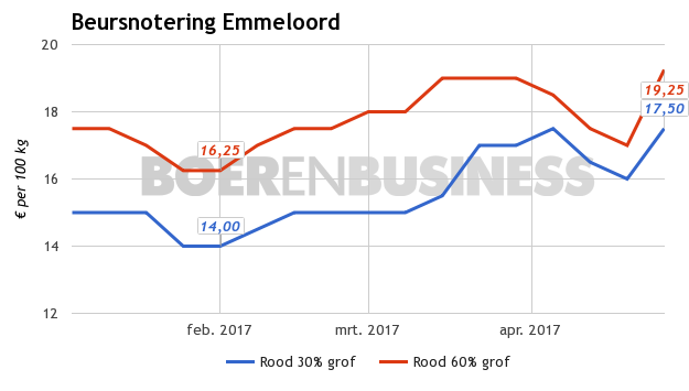 Het verloop van de rode uienprijs in Emmeloord. Meer prijzen? Bekijk de databank.