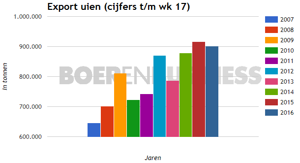 Het exportcijfer van uien in week 17 komt op basis van voorlopige informatie uit op 17.547 ton. Verder wordt het exportcijfer van uien verhoogd door nagekomen informatie van 2.873 ton. Voor het seizoen 2016/2017 staat de teller inmiddels op 901.918 ton, wat overeenkomt met gemiddeld 20.974 ton uien per week. Voor het kalenderjaar 2017 staat de exportteller op 295.468 ton, tegenover 332.303 ton afgelopen jaar.