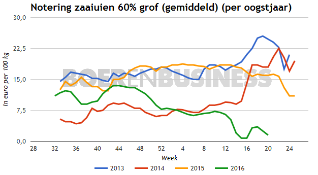 De notering van gele zaaiuien kwam deze week in Goes verder onder druk te staan. Voor de 30% grof werd 0,50 tot 1 euro per 100 kilo genoteerd. Dat is een daling is van gemiddeld een halve euro. Bij de 60% grof kwam de daling gemiddeld uit op 1,25 euro. Genoteerd werd 1 tot 2,50 euro per 100 kilo.