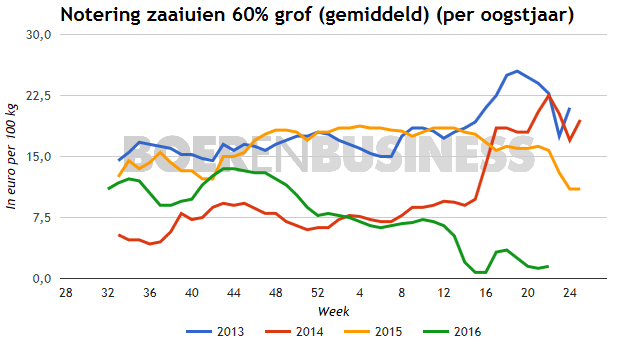 Nadat Emmeloord vorige week niet heeft genoteerd vanwege Hemelvaart, is deze week het noteren van gele zaaiuien hervat. De notering van deze week komt op hetzelfde niveau uit als van 14 dagen geleden. Dat betekent dat er voor de 30% tot 60% grof sortering 0,25 tot 1,00 per 100 kilo is genoteerd en voor de 60% grof sortering 0,50 tot 2,00 euro per 100 kilo. De stemming bleef "Flauw".