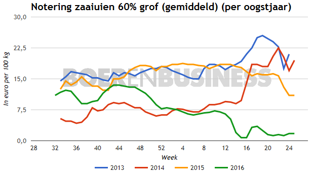 De gemiddelde notering voor zaaiuien (60% grof), per 100 kilo, over de jaren heen.