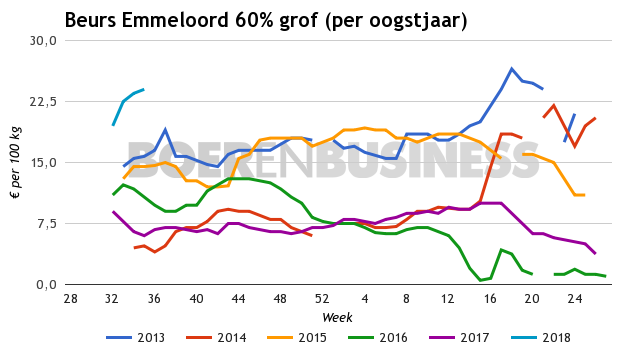 De 3 regionale beurzen zijn eensgezind in hun noteringen voor de sortering 0% tot 30% grof, waarmee deze uitkomt €15 tot €17. Wanneer alle 3 de regionale beurzen naast elkaar worden gelegd, wordt voor de 30% tot 60% grof €17 tot €22 genoteerd en voor de €60% opwaarts €20 tot €26.