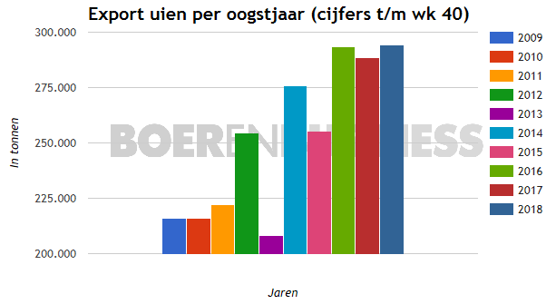 De nieuwste cijfers inzake de export van Nederlandse uien zijn bekend en maken duidelijk dat op basis van voorlopige informatie in week 40 ruim 21.000 ton uien zijn geëxporteerd. Door nagekomen informatie is het exportresultaat van de weken voorafgaand aan week 40 verhoogd met 167 ton. Dit met elkaar zorgt voor een exportresultaat voor dit seizoen van 294.312 ton, wat overeenkomt met 21.022 ton per week.