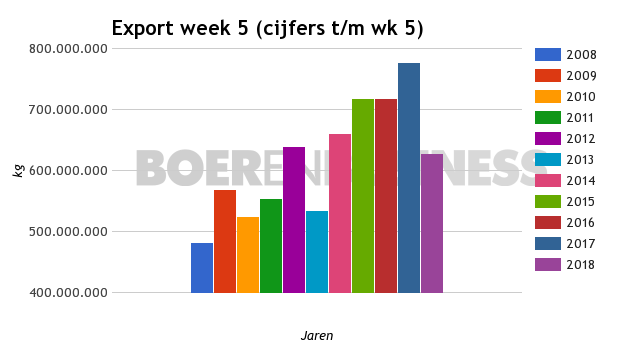Dat het seizoensgemiddelde boven de 20.000 ton uitkomt, is te danken aan de eerste seizoenshelft. Na de jaarwisseling vallen de exportcijfers namelijk een stuk lager uit. Tijdens de eerste 5 weken van 2019 is er 52.971 ton geëxporteerd. In 2018 werd tijdens de eerste 5 kalenderweken 107.969 ton geëxporteerd (-51%) en in 2017 was dat 111.576 ton (-53%).