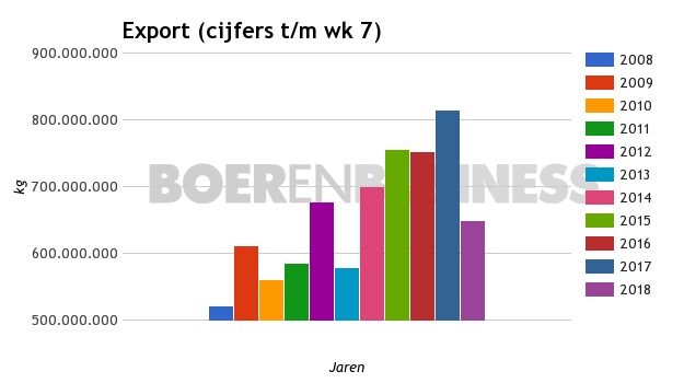 Het voorlopige exportcijfer komt voor week 7 uit op 10.335 ton uien. Het recordaantal dat in 1 week geëxporteerd werd, is 38.880 ton (week 46 van 2016). Tel hier nog wat extra gecreëerde sorteercapaciteit bij op (wegens nieuwe sorteerlijnen) en dan wordt momenteel slechts circa 25% van de Nederlandse sorteercapaciteit benut.