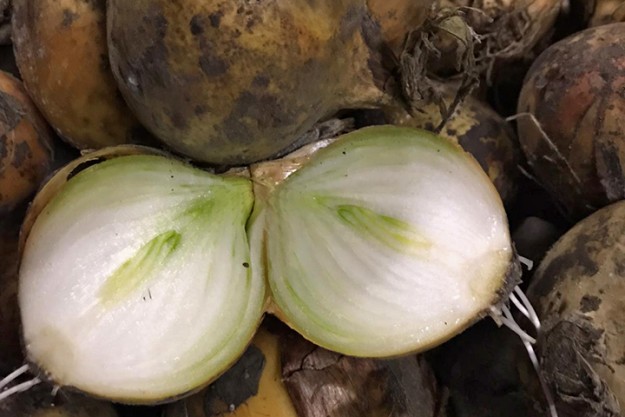 In de meeste percelen die nog op het land liggen, zien Jonker en zijn collega’s spruitvorming. "Dit hoeft echter niet te betekenen dat de spruitrust is doorbroken", zei hij eerder al. "Het betreft groen schot en dit is anders dan geel schot. Ook zien we wortelgroei. Zowel bij uien die nog vast stonden, als die in het zwad lagen. Dit is een landelijk fenomeen. Bacterie en fusarium zijn eveneens zichtbaar. In partijen waar primaire fusarium in voorkomt, is nu secundaire bacterie in te vinden. De lader zeeft snotterige uien er wel uit."