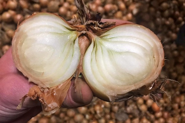 Eén ding is zeker: de uien zijn er na de regen niet mooier op geworden. Ze ogen grauw en zijn donkerbruin van kleur. Toch valt het soms ook mee. Eenmaal in de cel of kist ziet het product er al heel anders uit. Na goed droogstoken kan er een prima ui in de bewaring liggen.