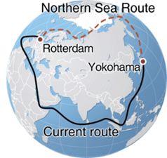 Volgens schattingen van de wetenschappers aan de University of California in Los Angeles zal het binnen vijftig jaar mogelijk zijn per schip uit Europa naar Azië te varen via Noordpool in plaats van, zoals nu, door het Panamakanaal of het Suezkanaal. Een andere route die recentelijk open is gegaan door de opwarming van de Aarde is de zogeheten Noordzee Route (bijna 5000 kilometer) door Russische wateren. Die route, alleen tussen juli en november te gebruiken op het moment, is aanzienlijk korter.