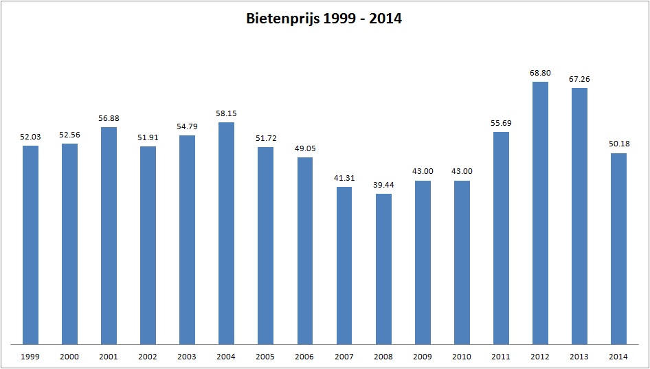 Na de recordbietenprijs in 2012 van 68,80 euro per ton is de prijs in de jaren daarna weer terug gezakt. Niet geheel onverwacht, want Cosun had bij de presentatie van de recordprijs al aangegeven dat dat niveau niet vast te houden is. Het jaar erna valt de daling alleszins mee; over oogst 2013 wordt er een resultaat van 67,26 euro geboekt. Maar over campagne 2014 zien bietentelers een verlies van 17 euro als de bietenprijs op 50,18 euro uitkomt.