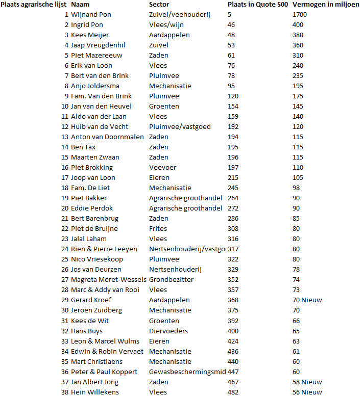 Net als voorgaande jaren is vooral de vleessector, in de breedste zin van het woord, goed vertegenwoordigd in de lijst. 500 extra namen leveren dan ook vooral heel veel extra vleesverwerkers op. De lijstuitbreiding maakt het ook voor het eerst mogelijk een akkerbouwer/melkveehouder te noteren: Ad Buijs. Hij staat op plek 801 met 32 miljoen euro en is actief in de melkveehouderij in Brabant en Groningen. Andere namen die opvallen in de verlengde lijst zijn; Adrie Murre van uienbedrijf TOP (plek 727, 36 miljoen), Jaap Reesink (plek 752, 35 miljoen) en Ad Ploeger (plek 984, 25 miljoen).