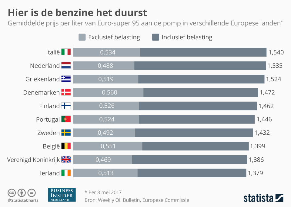In de onderstaande grafiek, samengesteld door databureau Statista voor Business Insider Nederland, ziet men de samenstelling van de gemiddelde pompprijzen van een liter euro 95-benzine in de 10 EU-landen waar benzine het duurst is. Nederland staat op de tweede plaats.