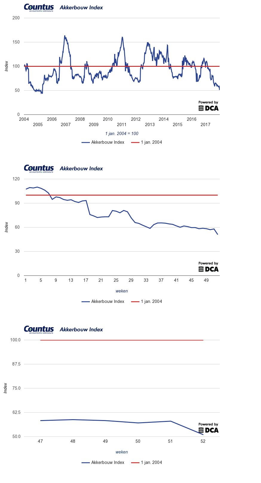 De Countus Akkerbouwindex is onderweg naar een nieuw diepterecord. Met het huidige tempo is die niet ver verwijderd. Het jaar 2017 werd afgesloten met een indexcijfer van 51. Dat is het slechtste resultaat sinds april 2005. Toen stond de index nog lager, met een notering van 44.2 punten.