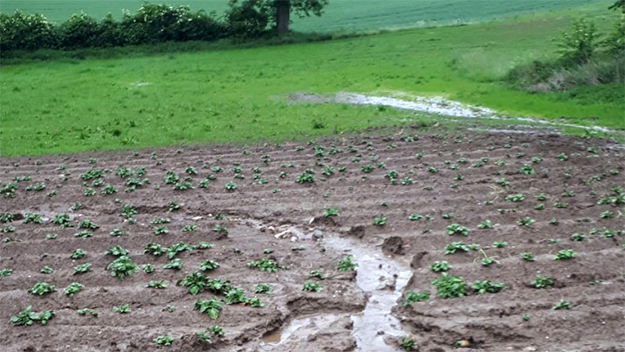 De regen in Zuid-Limburg zorgt voor problemen in de aardappelpercelen.