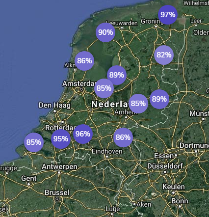 Het weertype van de afgelopen dagen is gunstig voor de groei van de aardappelgewassen. Met name na de regenbuien blijft het vocht hangen. De Sencrop weerpalen meten ook de luchtvochtigheid. Op sommige percelen wordt vrijdag zelfs een luchtvochtigheid van hoger dan 95% gemeten.