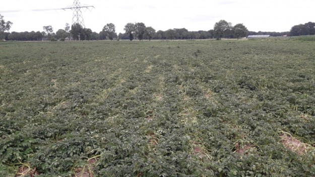 Op het perceel in Goor viel de afgelopen drie dagen, 22 millimeter. Op dit perceel was het begin van de week nog erg droog. Het gewas begon daardoor terug te groeien, maar daar lijkt nu verandering in te komen. Het gewas zal uiteraard niet meer geheel bij trekken, maar de gevallen neerslag zal wel bijdragen aan de knolzetting.