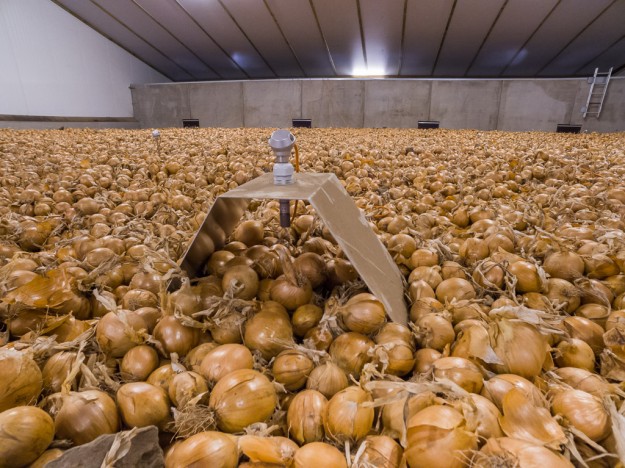 Bij uien geldt: liever droog dan koud. De uien die een geslaagde MH-bespuiting hebben ondergaan en nu iets warmer bewaard worden (7-8°C), blijven met de kwakkelende winter en hoge nachttemperaturen ook nauwelijks op temperatuur. Nog belangrijker dan temperatuur is echter de relatieve luchtvochtigheid. Die moet op een voldoende laag niveau blijven. Een RV van 80% is goed. Als het niet koud genoeg wordt s’nachts om in de fase bewaren te ventileren met buitenlucht, zijn er twee mogelijkheden: de instelling op de Vision Control bewaarcomputer ‘buiten t.o.v. product’ verkleinen of kiezen om de bewaarfase te veranderen naar ‘drogen.’ De Vision Control zal dan ventileren met buitenlucht als de lucht drogend is op basis van RV- metingen binnen en buiten.