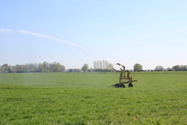 Grasland wordt op zandgrond al volop beregend om de eerste snede te redden.