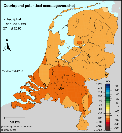 Het huidige neerslagtekort is nog nooit zo groot geweest in deze tijd van het jaar. Dat blijkt uit de droogtemonitor van de Landelijke Coördinatiecommissie Waterverdeling (LCW) van vandaag. Ondertussen gelden nieuwe beregeningsverboden.
