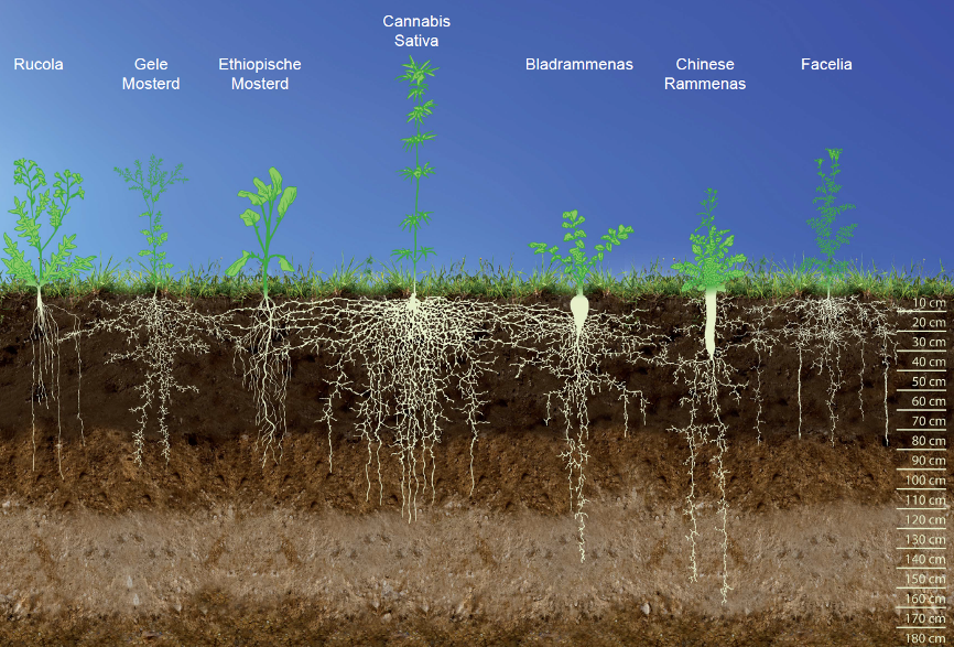 Tussen de soorten groenbemesters bestaan grote verschillen in bewortelingsdiepte en –intensiteit, zo is duidelijk te zien in onderstaande afbeelding. Bladrammenas is van alle gangbare groenbemesters de beste structuurverbeteraar, met een dikke penwortel die de bouwvoor openbreekt en fijne haarwortels die tot wel 2 meter diep wortelen. Daarmee gaat bladramanas het diepst van alle groenbemesters. Facelia wortelt ondiep maar behoorlijk intensief en maakt de bouwvoor luchtig en kruimelig.