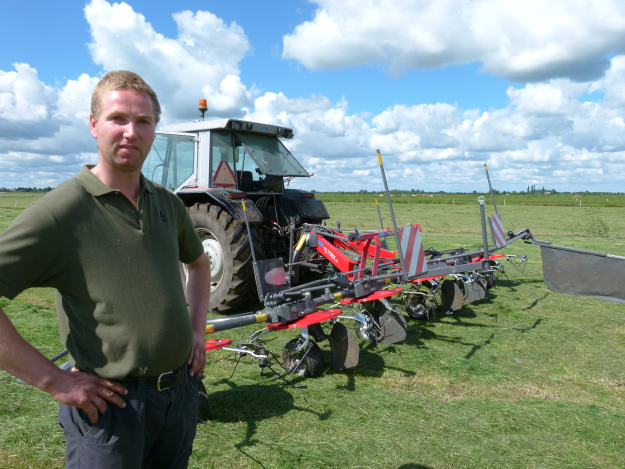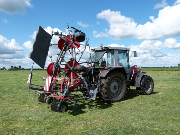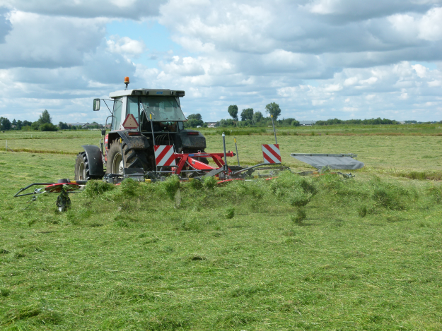 Rene Koot uit Zegveld nam onlangs de eerste nieuwe haaktand schudder van MF in gebruik. In maatschap met zijn ouders heeft hij een melkveebedrijf met ruim 80 koeien en een kleine 40 ha grasland. Koot heeft inmiddels twee sneden gewerkt met de MF TD 776 XDN en is er prima over te spreken. "Het is een goede machine, hij legt het gras keurig gespreid neer. Ook als je uit het zwad schudt." Toen Koot ging nadenken over een nieuwe schudder stond al van tevoren vast dat het een MF zou worden. "Wij zijn altijd trouw aan onze MF-dealer de Bruin in Bodegraven. Die staan altijd voor ons klaar", vertelt Koot.