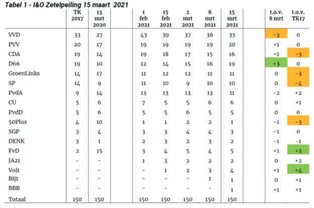 Volgens I&O Research lijkt de meest actuele peiling veel op de uitslag van de Tweede Kamerverkiezingen van 2017. Van de winst die de VVD boekte in de coronacrisis is niets over: nu 33 zetels, 4 jaar geleden ook 33 zetels. Ook de andere coalitiepartijen (PVV, D66 en ChristenUnie) hebben nu in de I&O-peiling ongeveer evenveel (virtuele) zetels als ze bij de verkiezingen van 2017 behaalden.