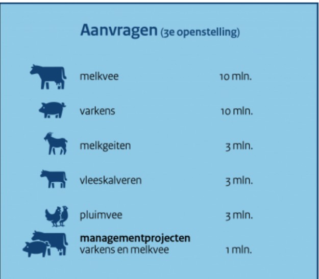 Voor de nieuwe ronde is een bedrag van €30 miljoen te verdelen, meldt RVO. Het gaat in dit geval om de innovatiemodule. Doel van de regeling is om met nieuwe, onbewezen systemen te stimuleren die de emissies van methaan en ammoniak uit veestallen beperken en ook de uitstoot van geur en fijn stof aanpakken. Het totale subsidiebedrag is opgedeeld in budgetten per diersoort.