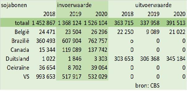De import vanuit de Verenigde Staten daalt wel al jaren achtereen, maar de VS zijn nog altijd het tweede herkomstland voor soja die in Nederland aankomt. Canada is een leverancier in opkomst, met (nog ver daarachter) Oekraïne. Bij doorvoer van sojabonen is Duitsland de belangrijkste afnemer.