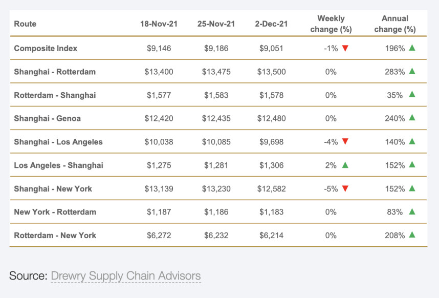 Afgelopen maand zijn de prijzen, zoals beschreven, redelijk gestabiliseerd. De maand november werd namelijk afgesloten met een prijs van $9.186 per 40 voets container. De trend van stabilisatie voor in de eerste week van december doorgezet. De World Container Index noteert op donderdag 2 december een prijs van $9.050 per 40 voets container, een daling van 1,5% vergeleken met vorige week. De samengestelde index blijft echter op een hoog niveau staan. Het verschil met dezelfde periode vorig jaar bedraagt 196%. Ook logistiek dienstverlener Freightos noteert een stabiele trend, met een gemiddelde prijs van $9.351 per container.