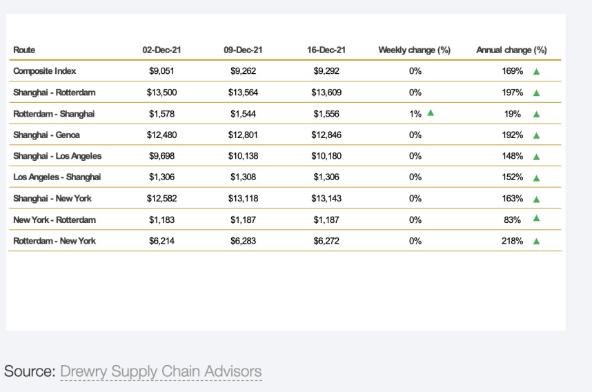 Zoals gezegd, is verlichting daarom nog niet aan de orde. S&P Global Platts meldt dat de 'vroege onderhandelingen' voor de contractprijzen van komend seizoen, dat in april begint, wijzen op blijvende bullishness. De vrachtprijzen zouden zomaar eens 20% tot 100% hoger kunnen liggen dan dit jaar het geval was. Dit komt deels doordat de wachttijden lang zijn. In het havencomplex van Los Angeles en Long Beach werd maandag 13 december de langste wachtrij ooit gemeten; 101 schepen waren aan het wachten op een losplek. Voor komende week is het nieuws positiever, dan verwacht Drewry een stabiele prijstrend.