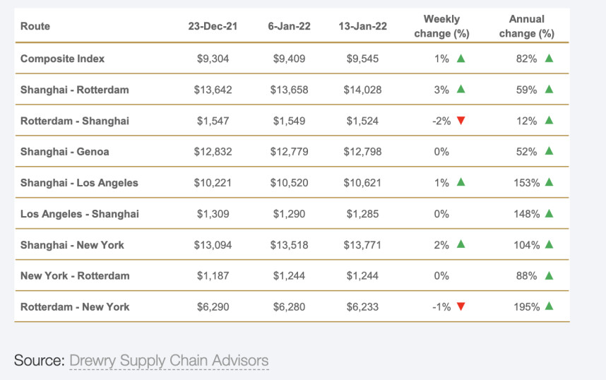Wanneer van Shanghai naar Rotterdam geëxporteerd wordt, moet $14.028 per container betaald worden. Dat is een stijging van 3% in vergelijking tot afgelopen week. De tarieven op de routes Rotterdam-Shanghai en Rotterdam-New York lagen over de afgelopen week wel iets lager. Het gaat om prijsdalingen van respectievelijk 2% en 1%. Maar dit is niet voldoende om de prijsstijgingen van transport uit Azië te compenseren. Verwacht wordt dat de prijzen komende weken blijven stijgen. Nieuwe hinder in de scheepvaart ligt daaraan ten grondslag.
