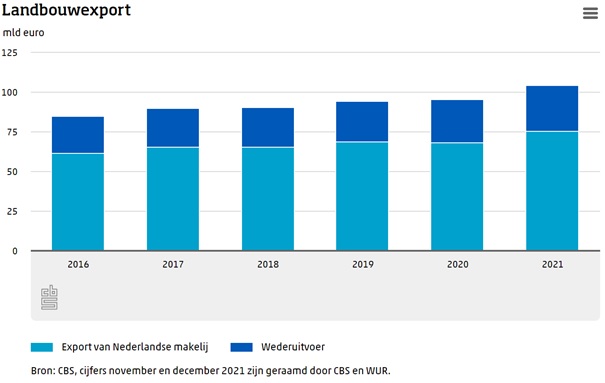 De waarde van de Nederlandse landbouwexport is in 2021 opnieuw gestegen tot recordhoogte. Ondanks de voortdurende coronacrisis en het eerste jaar van de brexit is het vorige record van 2020 ruim verbroken. De landbouwexport heeft in 2021 een recordwaarde opgebracht van €104,7 miljard, 9,4% (oftewel €9 miljard) meer dan het jaar ervoor.
