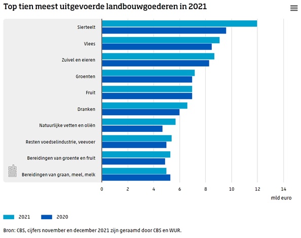 Sierteelt is goed voor een exportwaarde van €12 miljard, een kwart meer dan een jaar eerder. Vlees is het tweede meest uitgevoerde landbouwproduct. De vleesexport nam met 7% toe tot €9,1 miljard in 2021. Ook alle andere belangrijke landbouwgoederen noteren een exportgroei. Alleen de export van bereidingen van graan, meel en melk is gekrompen. Een oorzaak hiervan is de forse afname van de export van babymelkpoeder naar China.