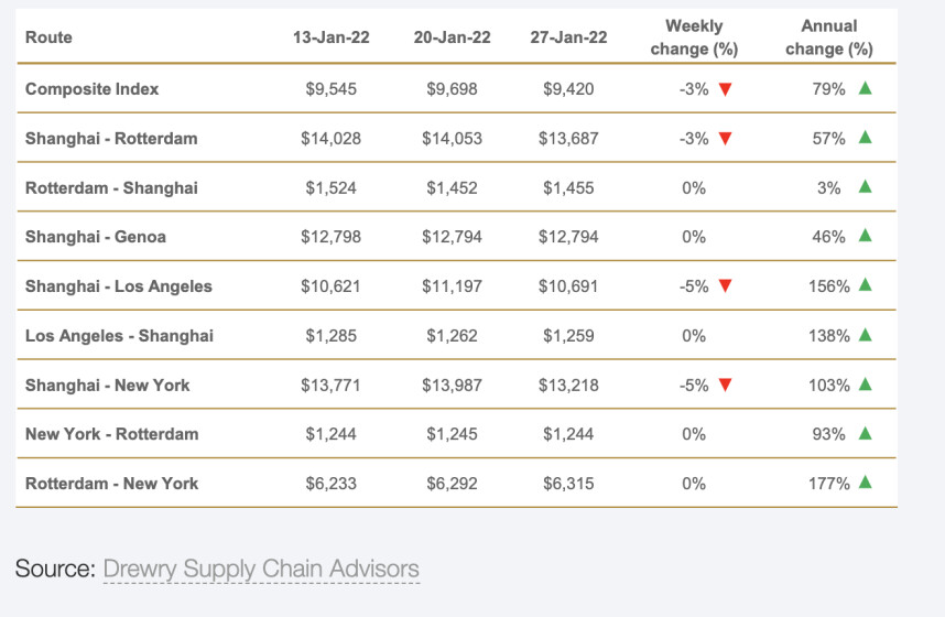 De World Container Index van Drewry laat voor deze week een daling zien van 2,9% tot $9.419 per 40 voets container. Daarmee ligt de prijs op dit moment nog 79% boven het prijsniveau van vorig jaar. Het transport van Shanghai naar Los Angeles en van Shanghai naar New York daalde het hardste in prijs (-5%). Freightos noteert voor transport van Azië naar de westkust van de Verenigde Staten een bedrag van $15.485 per container. Voor transport richting de oostkust van de Verenigde Staten moet gemiddeld $16.781 per 40 voets container betaald worden. Beide prijsniveau zijn ongeveer gelijk aan vorige week.