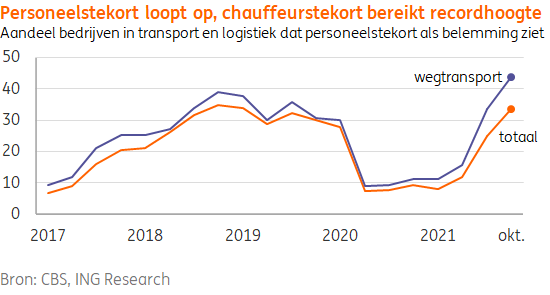 ING Research ziet ook nog wat beren op de weg voor dit jaar. "De hogere loonkosten, de opgelopen brandstofprijzen en de hogere kosten van materieel zorgen dit jaar zeker nog voor bredere prijsdruk in transport", schrijven onderzoekers van de bank in een nieuwe analyse. "De inefficiëntie door verstoorde toeleveringsketen komt hier nog bovenop." Hoewel de bank erkent dat de containerprijzen geen representatief beeld geven over de hele transportsector, stelt zij wel dat ook het wegvervoer voor bedrijven in de bouw, retail en industrie dit jaar naar verwachting duurder wordt. Het personeelstekort speelt daar onder meer een rol in.