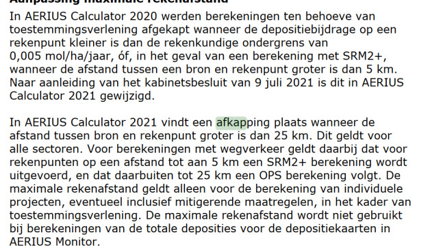 Het RIVM ging ook rekenen met de nieuwe uitstootgrens, maar hanteert geen uniform rekenmodel binnen de 25 kilometer, zo blijkt uit een impactanalyse van het instituut zelf. Tot 5 kilometer afstand van een weg of gebouw wordt voor stikstofneerslag het ene rekenmodel gebruikt, voor afstanden tussen de 5 en 25 kilometer het andere. Gevolg is dat tussen die 5 en 25 kilometer ook geen extra stikstofneerslag wordt toegerekend. Het aantal depositie-arme gebieden in Nederland blijft minimaal.