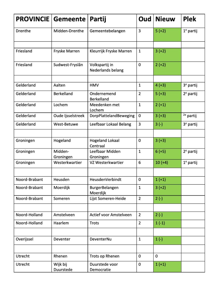 Zeven bondgenoten van BBB die nog niet in de raad vertegenwoordigd waren hebben genoeg stemmen gekregen voor één of meerdere zetels. Groep Jan Zwerus komt in Goeree-Overflakkee uit het niets op vier raadsleden, net als HMV in Aalten. Hogeland Lokaal Centraal krijgt drie zetels net als Kleurrijk Fryske Marren.