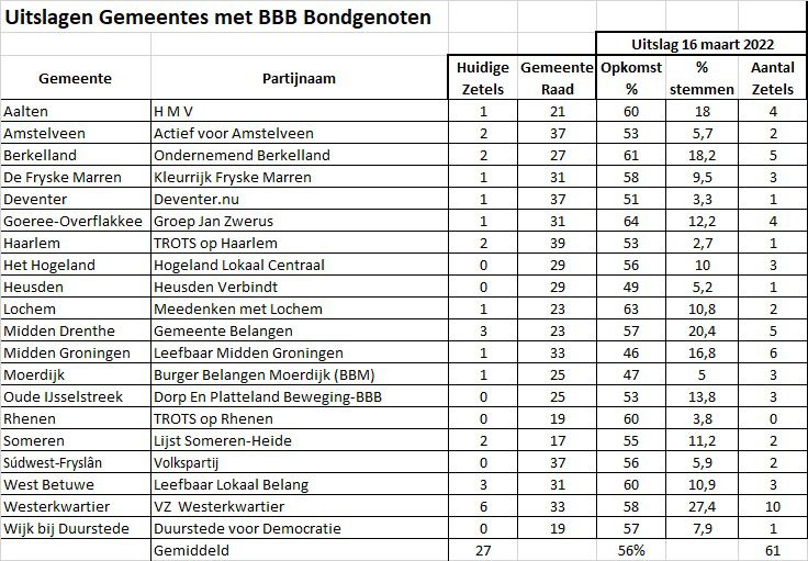 Geen van de bondgenoten verliest zijn vertegenwoordiging in de gemeenteraad. Van alle partijen die zich aan BBB hebben verbonden, heeft alleen 'Trots Haarlem' een raadszetel moeten inleveren (nu één zetel). Vijf partijen behouden hetzelfde aantal raadsleden, zoals in de woonplaats van Van der Plas waar 'DeventerNU' de zetel behoudt. De overige veertien staan op zetelwinst. Leefbaar Midden-Groningen gaat zelfs van één naar zes zetels in de gemeenteraad. VZ Westerkwartier, die van zes naar tien zetels gaat, wordt samen met een andere partij de grootste in die gemeente. Ondernemend Berkelland krijgt er drie zetels bij en heeft er nu vijf.