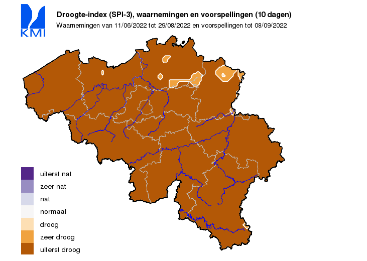 In België is het gebrek aan neerslag nog nijpender. Weerdienst KMI verwacht zelfs dat het tekort zo ver oploopt in de komende veertien dagen dat de lijn van 1976 wordt doorkruist. Op dit moment krijgen het westen, midden en oosten de classificatie 'uiterst droog'. KMI berekent dat de eerste week van september overal uiterst droog is. In Nederland ligt de lijn van '76 nog ver weg en die wordt dit seizoen ook niet meer gehaald. Qua zonuren ligt dat anders. Op 27 augustus was dezelfde hoeveelheid zonnestraling behaald als in heel de zomer van 1976. De gemiddelde straling bedroeg toen 229 watt per m². Dat is nu gemiddeld 238 watt per m².