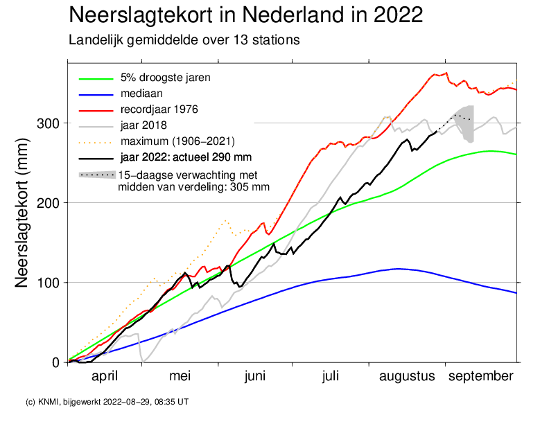 Het neerslagtekort in Nederland is opgelopen tot 290 millimeter en heeft daarmee het jaar 2018 geëvenaard. Het KNMI verwacht dat de komende zeven tot veertien dagen het tekort verder oploopt tot boven de 300 millimeter. Een ander weertype brengt enige neerslag, maar de hoeveelheid is gering.