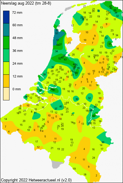 Het cumulatief voor de maand augustus bedraag in het uiterste noorden van Groningen zo'n 40 tot 50 mm. Ook de Friese kust kreeg regionaal nog een buitje. In Noord-Holland is deze maand tussen de 30 en ruim 50 mm gevallen. In andere gebieden komt de teller meestal niet verder dan 10 tot 20 mm deze maand.