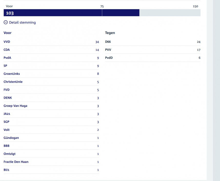 Het kabinet is overigens niet verplicht om een motie over te nemen, maar een royaal gesteunde motie, waar ook drie van de vier regeringspartijen achter staan, is ook niet eenvoudig naast zich neer te leggen.