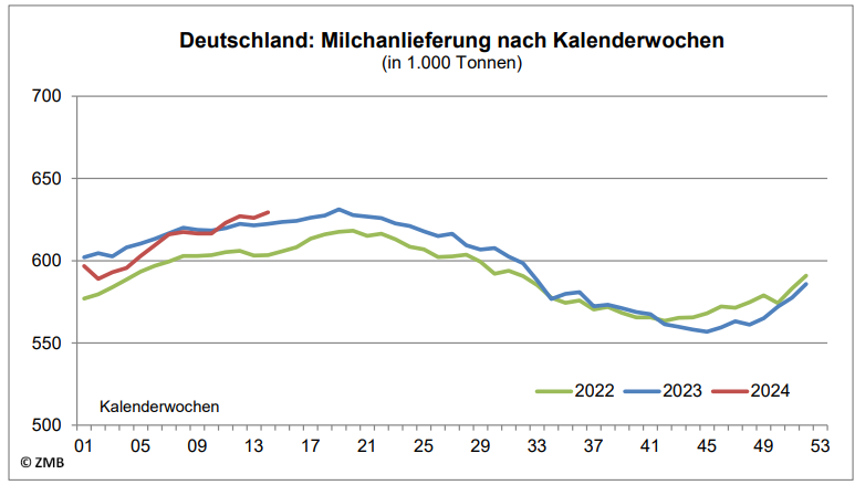 ZMB-data rapporteert over de Duitse melkaanvoer voor maart en april. In Duitsland namen zuivelfabrikanten in week 13 (start 25 maart) 0,2% minder melk aan dan de week daarvoor. In week 14 steeg de hoeveelheid juist met 5% ten opzichte van week 13. Daarmee was de melkaanvoer van week 14 1,1% hoger dan in dezelfde week vorig jaar en werd de seizoensgebonden stijging voortgezet.